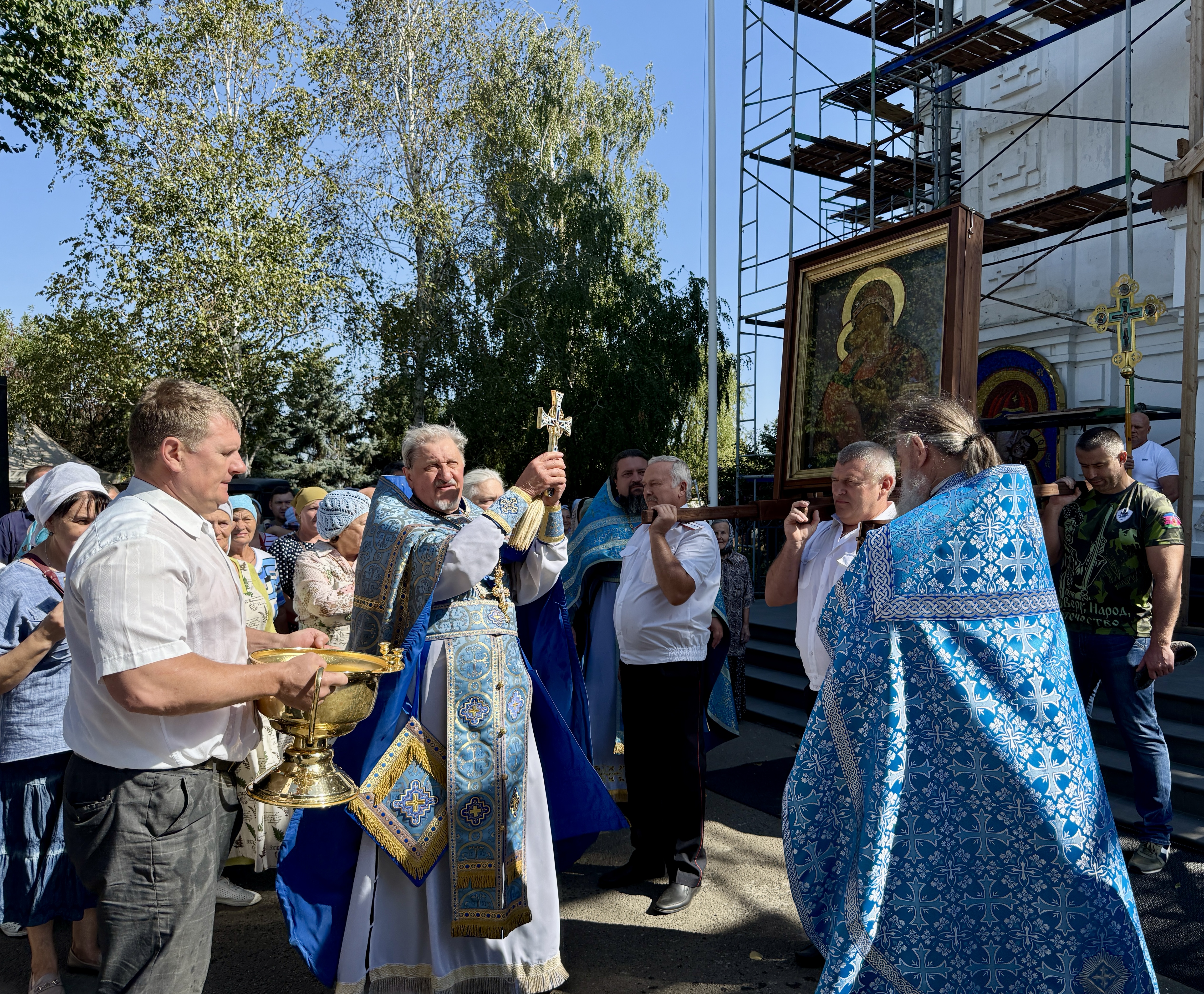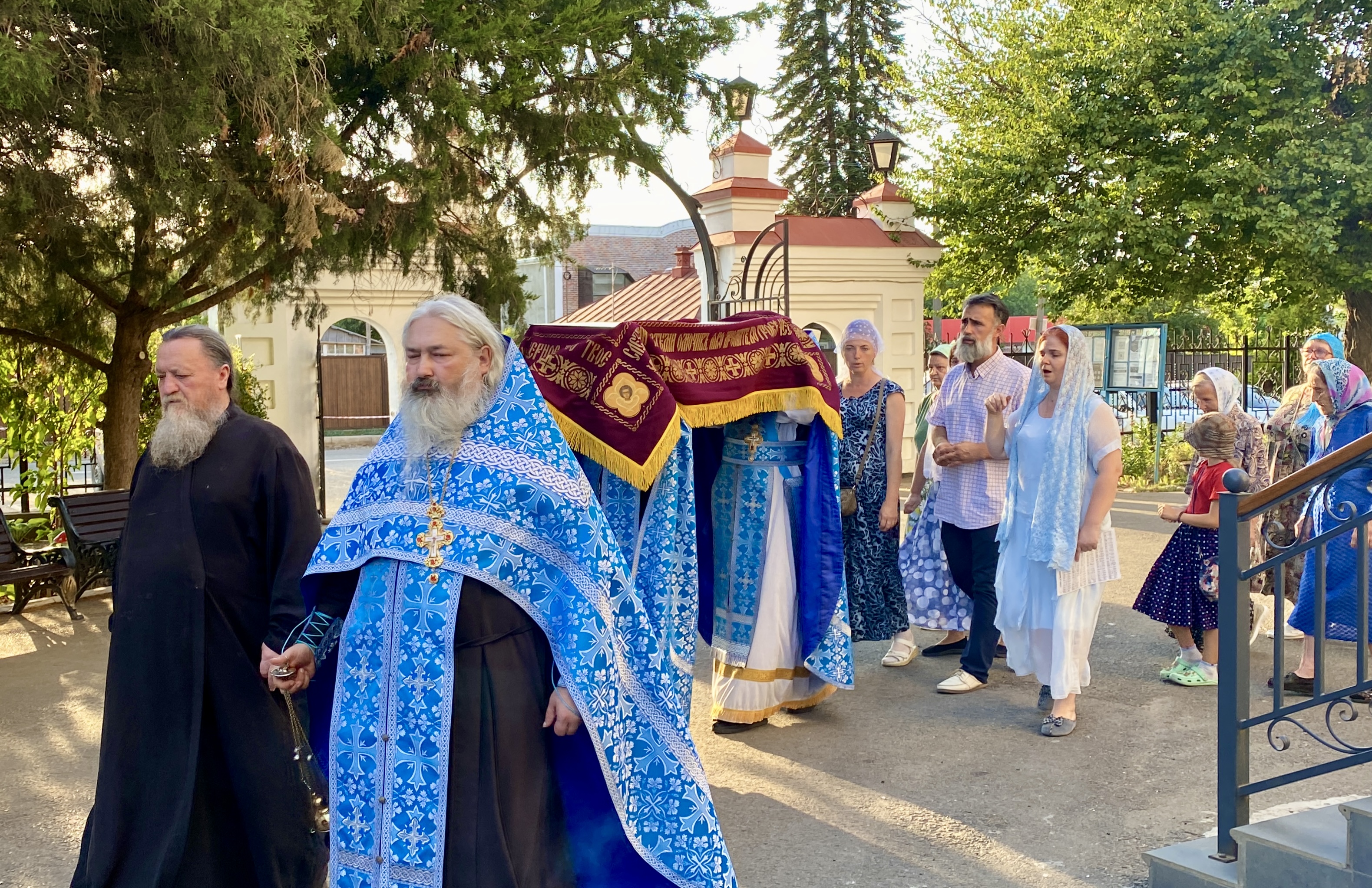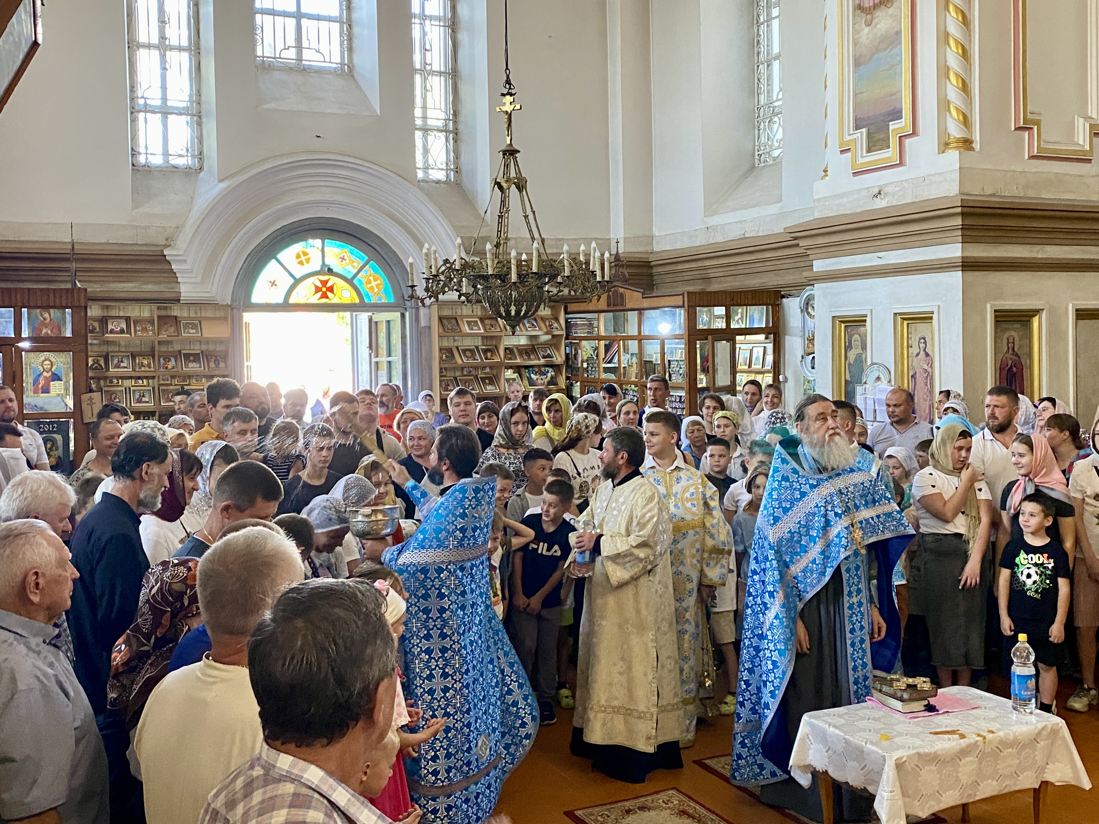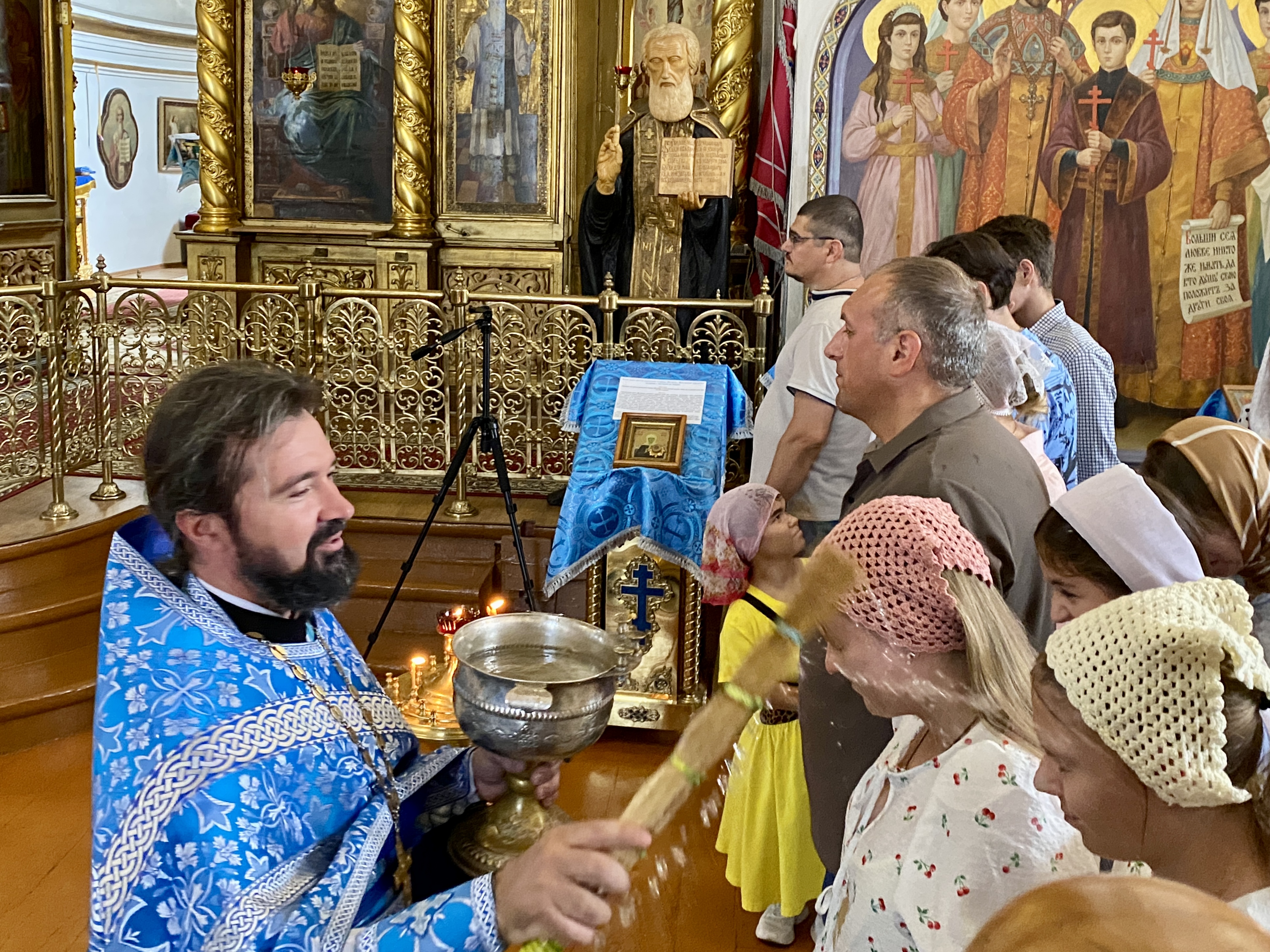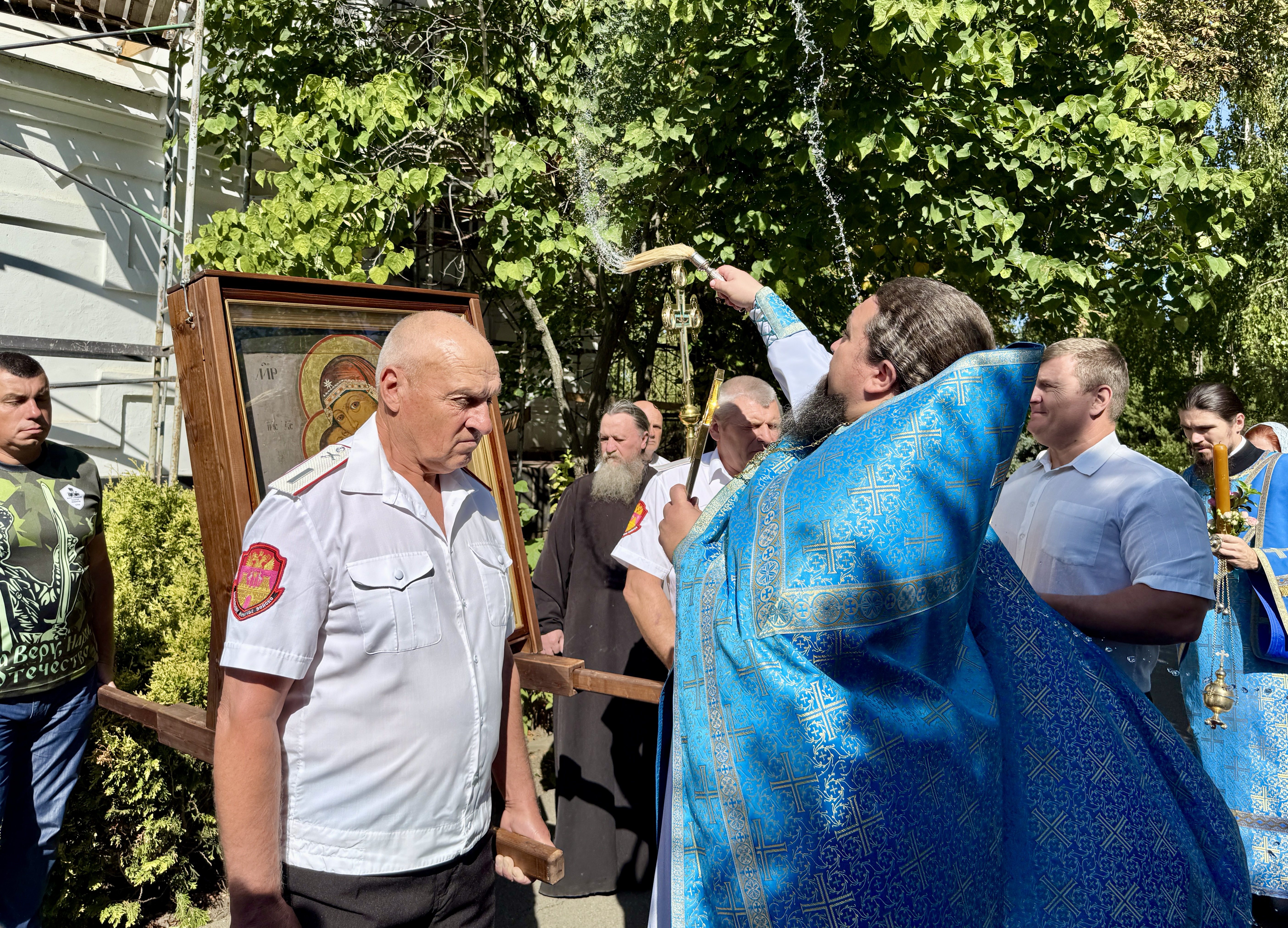 По завершении Литургии священнослужители совершили водосвятный молебен перед иконой Владимирской Божией Матери, после чего с молитвенным пением был совершен Крестный ход со святыней вокруг храма. Во время шествия батюшки щедро окропляли всех молящихся святой водой.