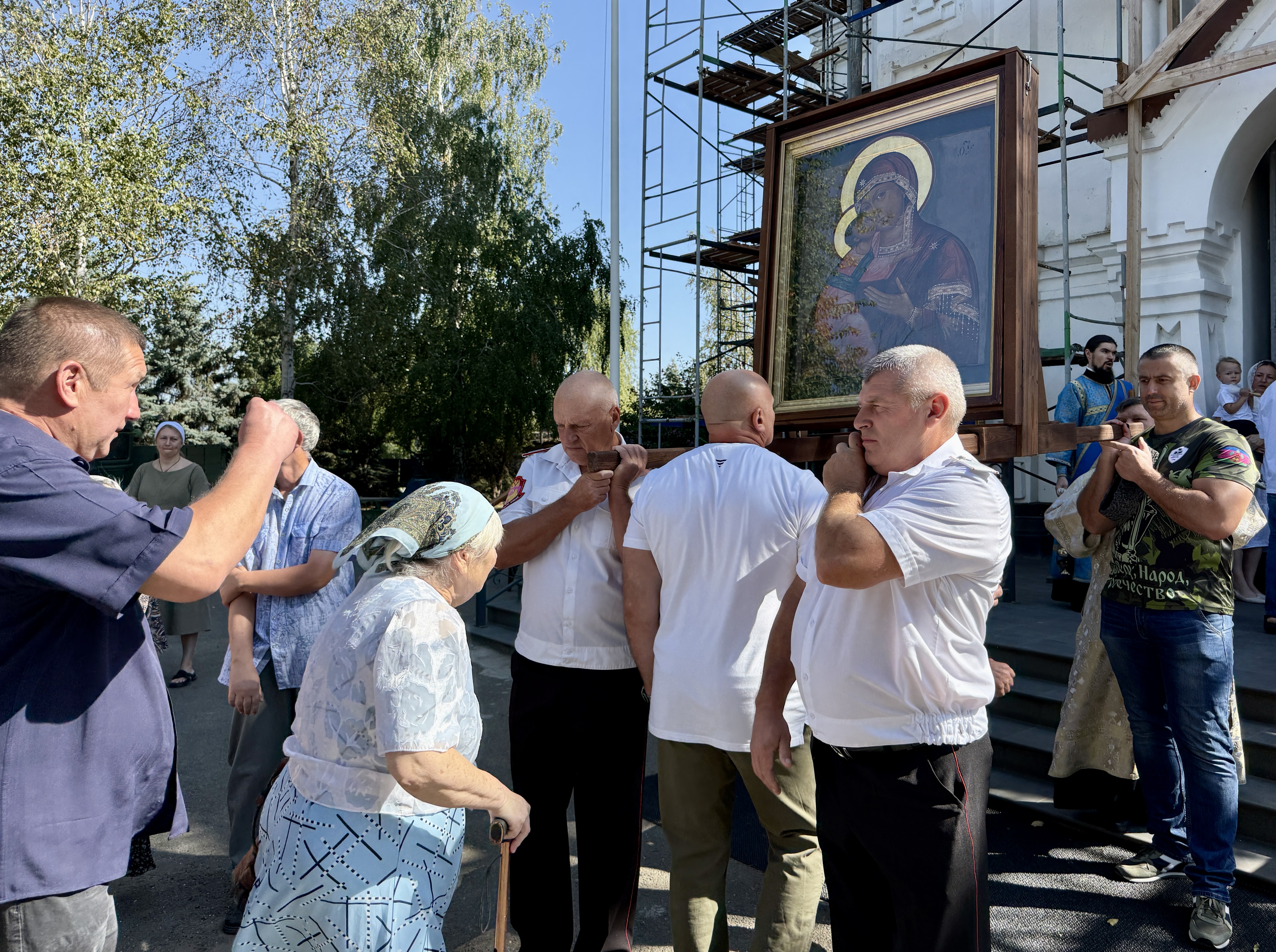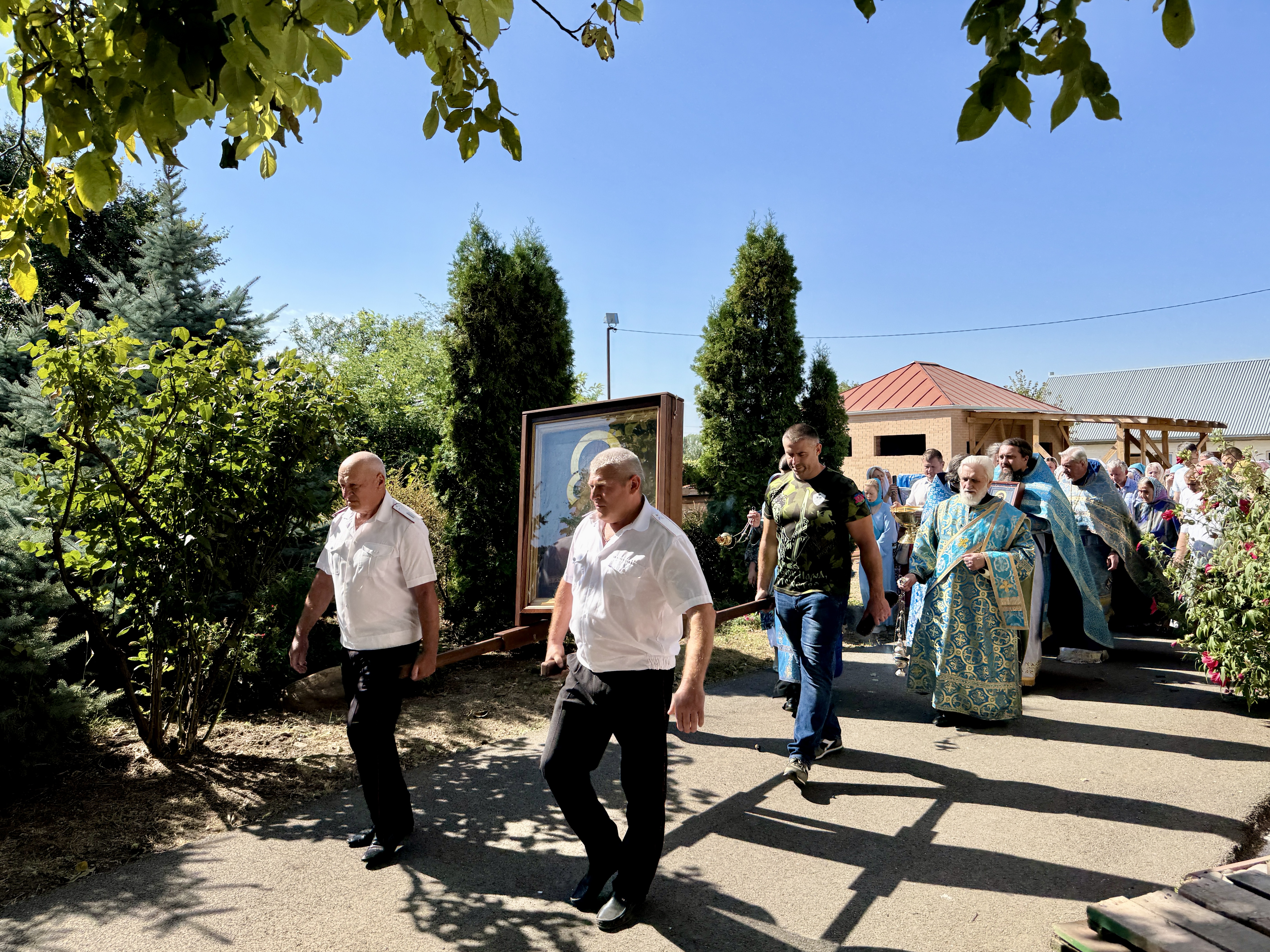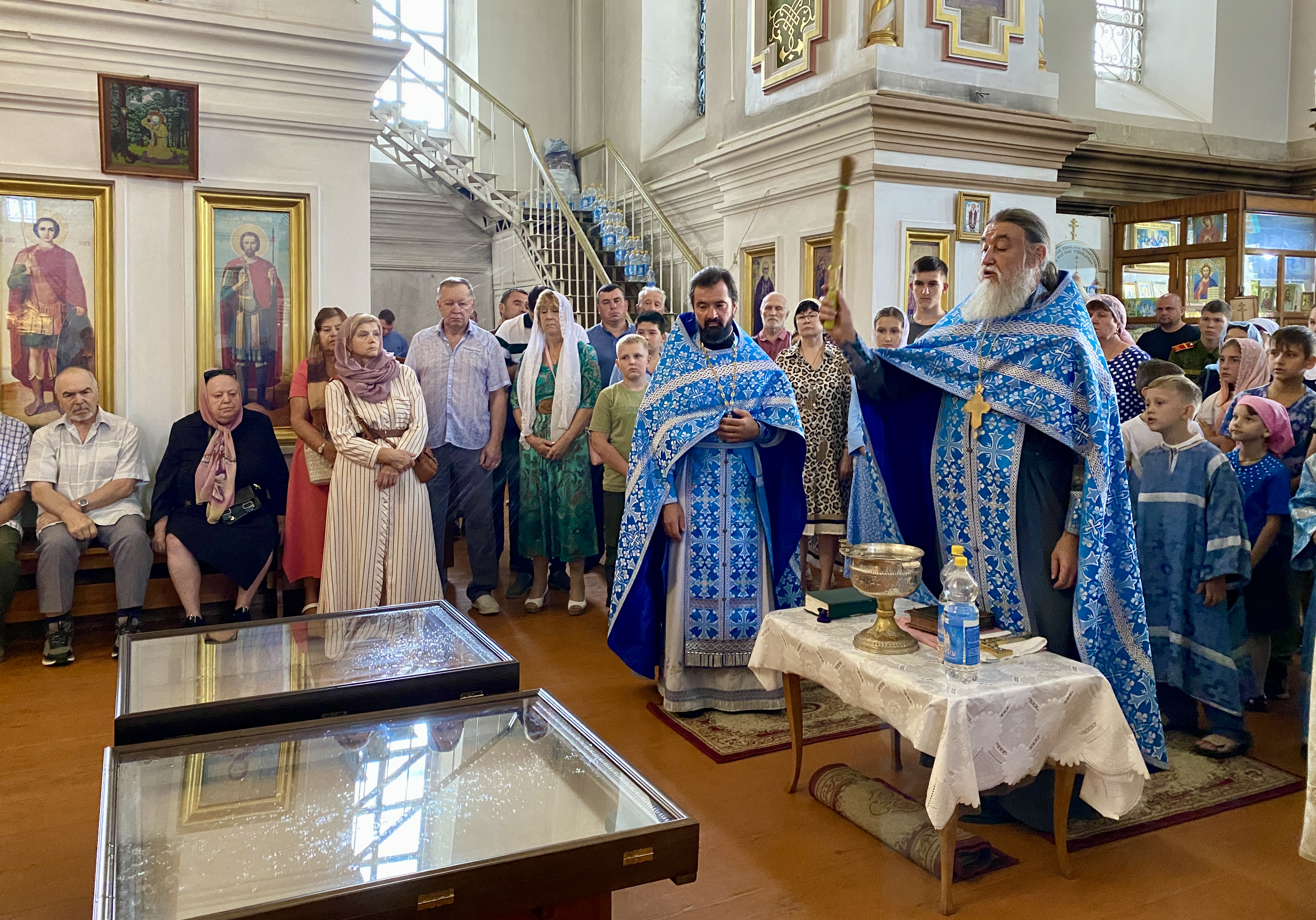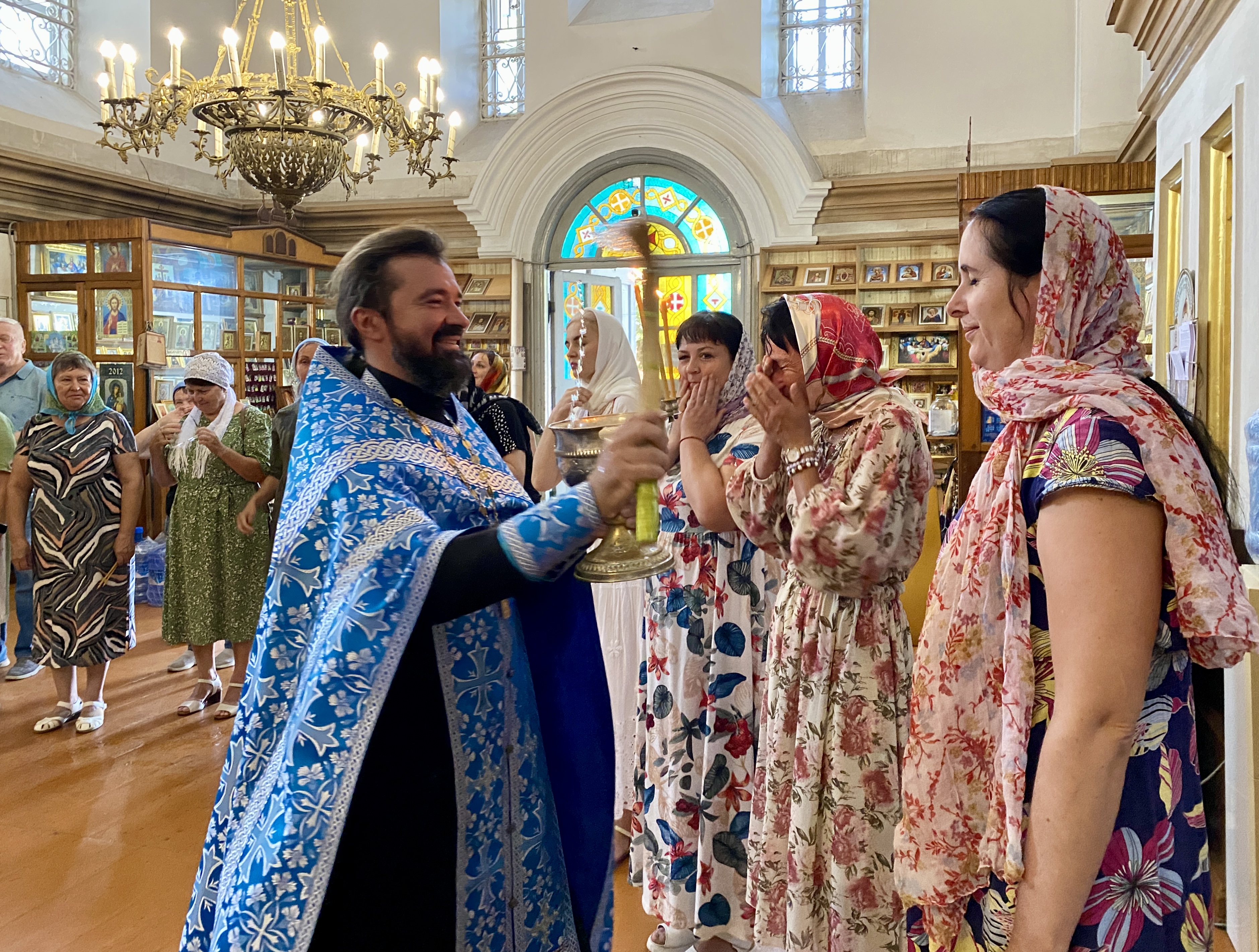 По завершении Литургии священнослужители совершили водосвятный молебен перед иконой Владимирской Божией Матери, после чего с молитвенным пением был совершен Крестный ход со святыней вокруг храма. Во время шествия батюшки щедро окропляли всех молящихся святой водой.