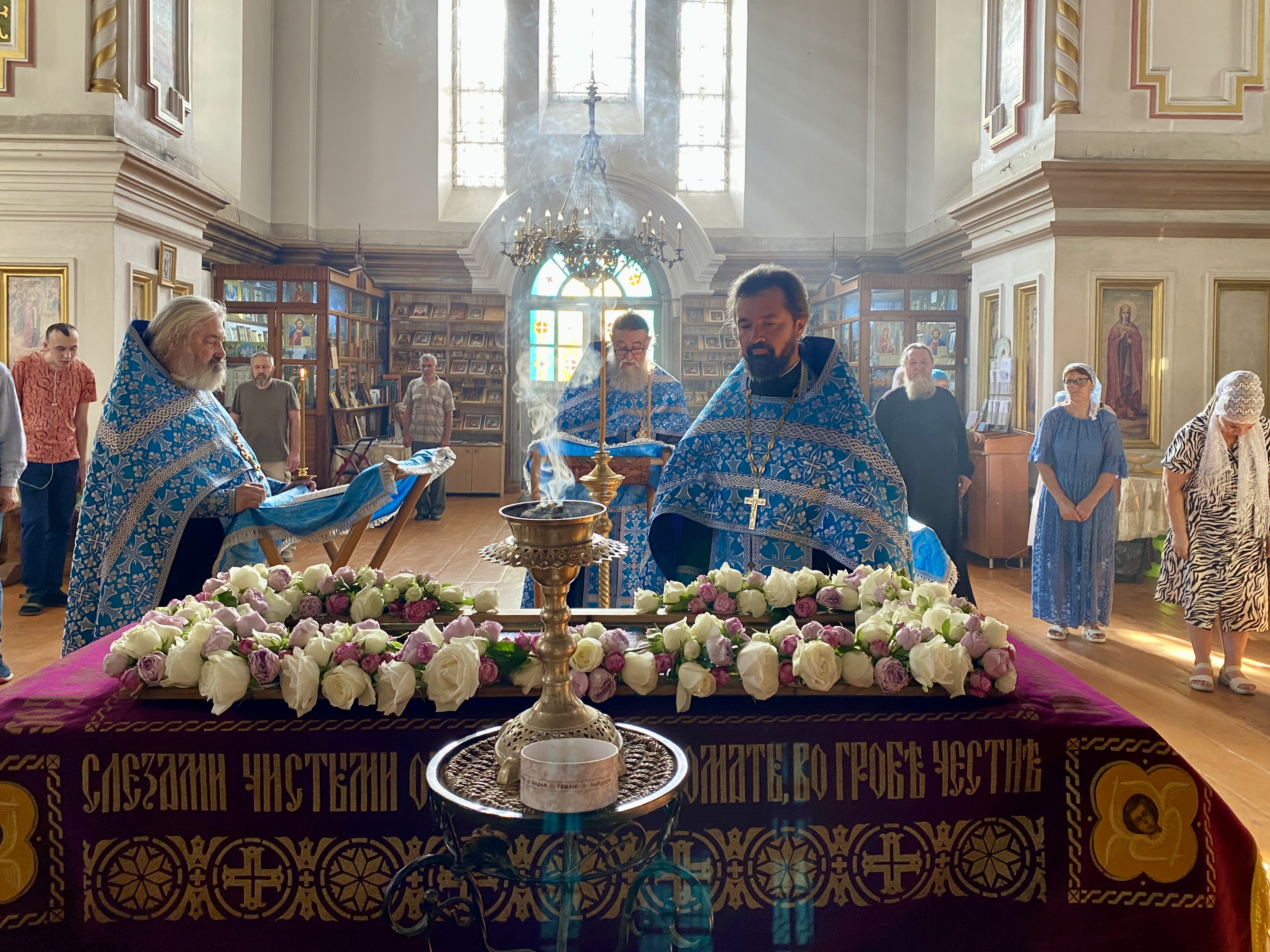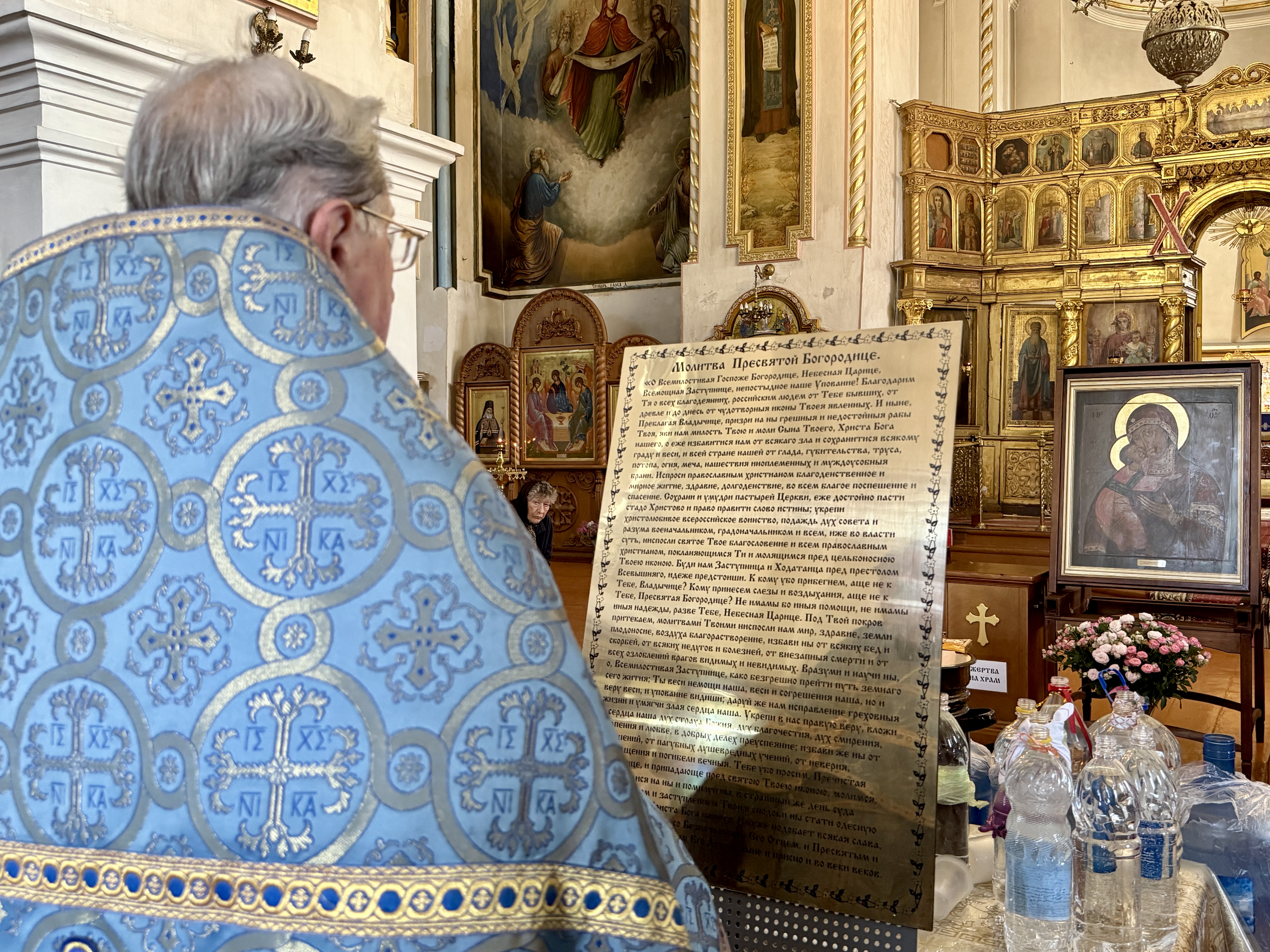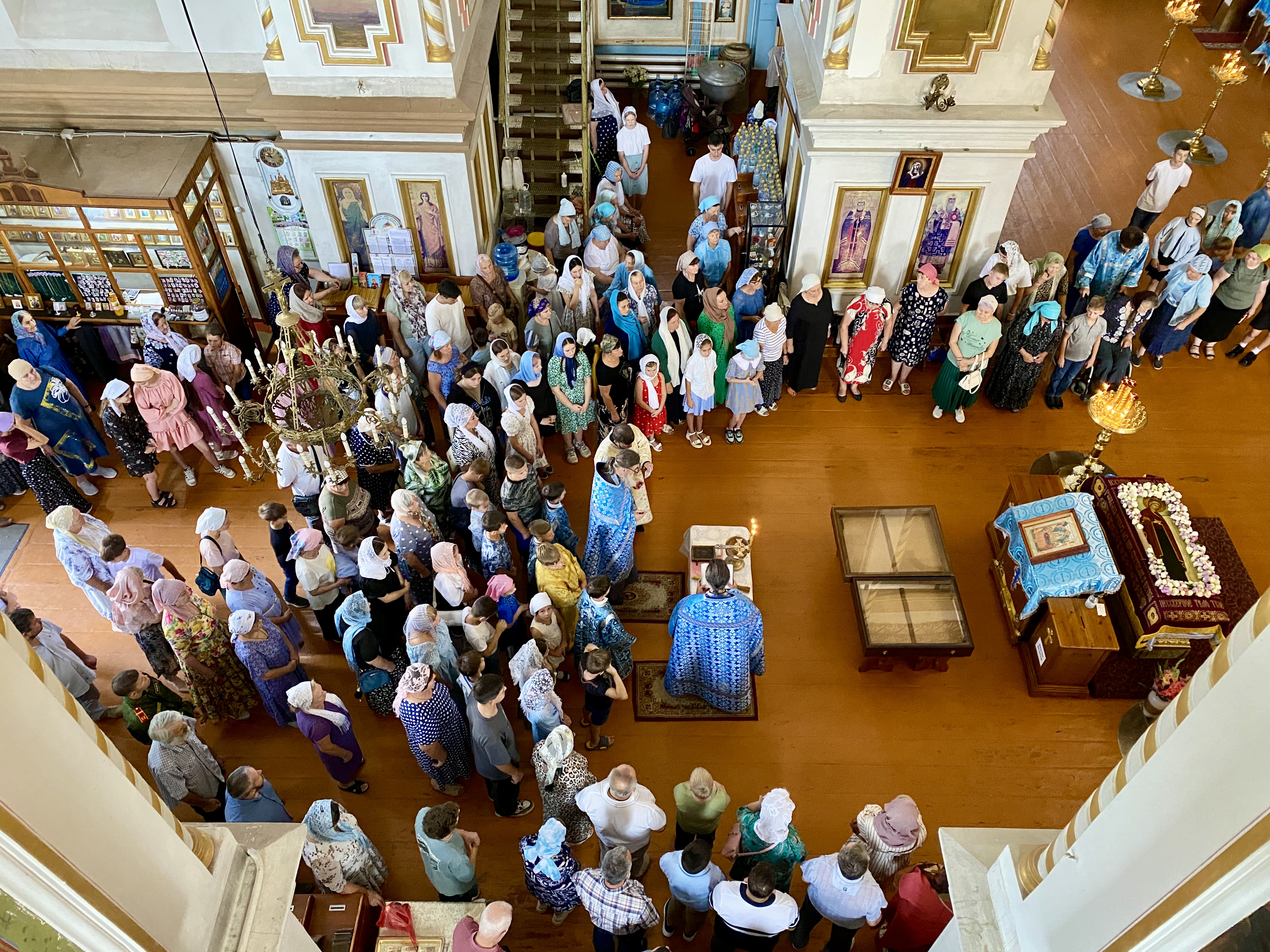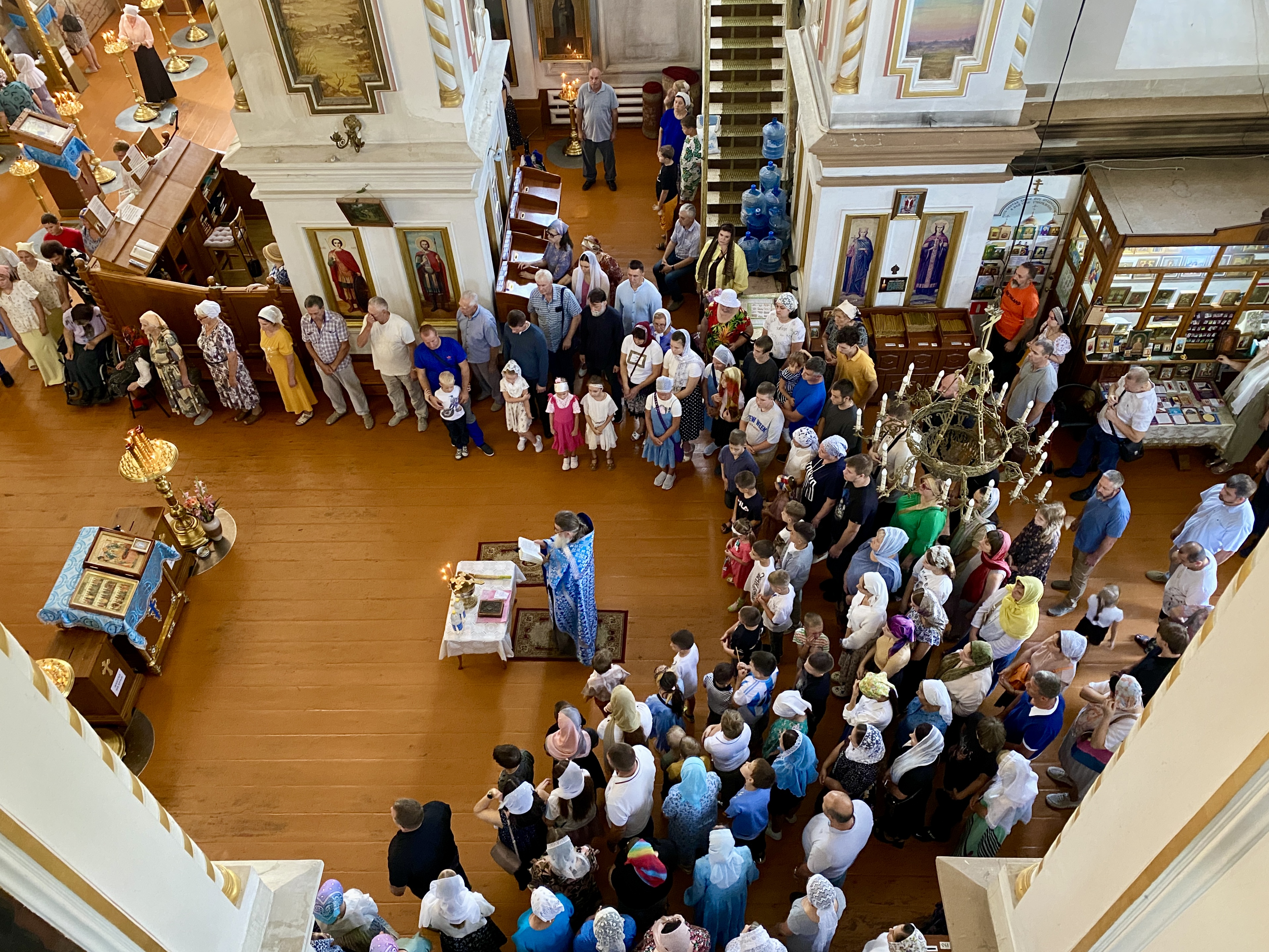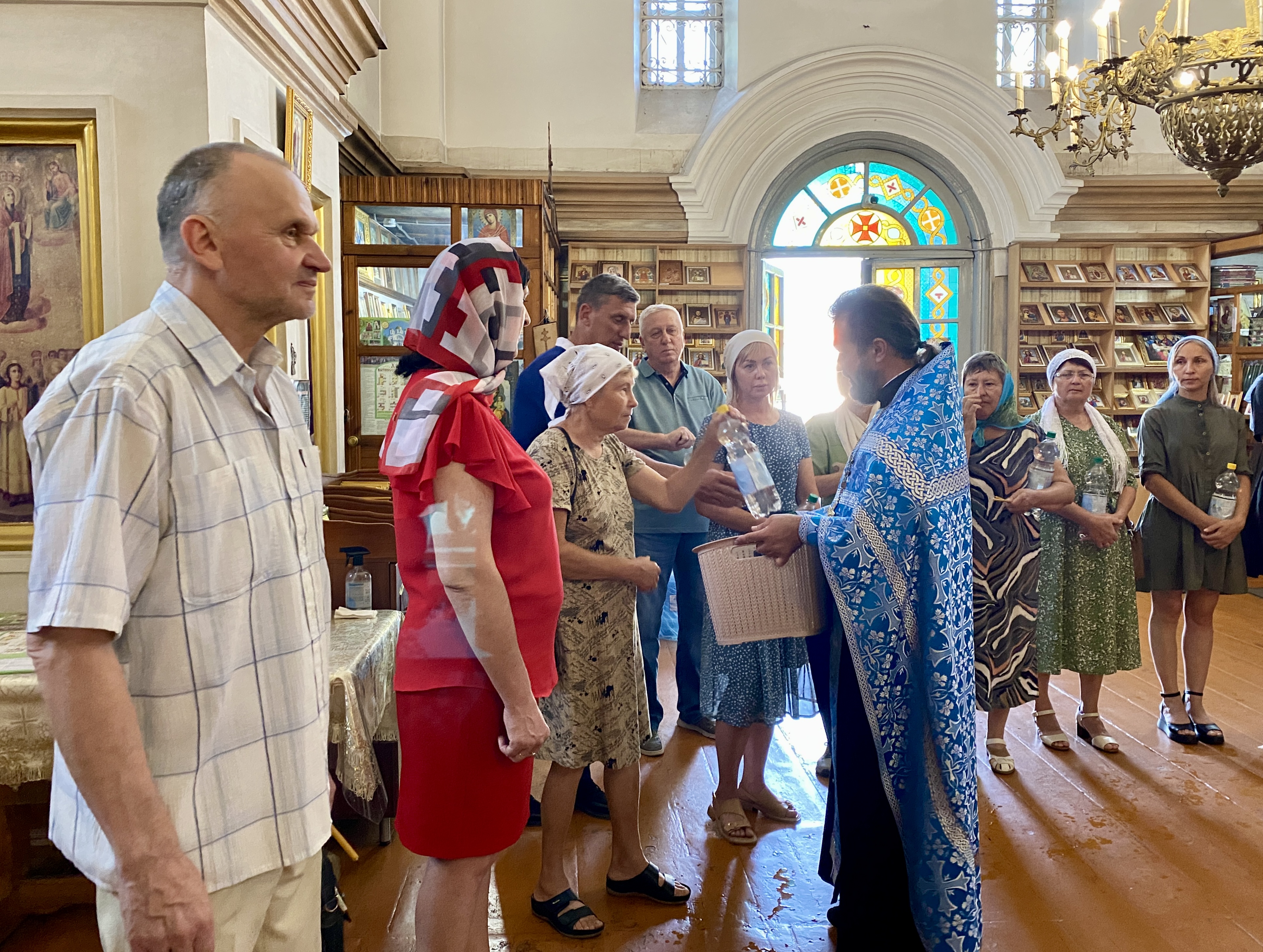 По завершении Литургии священнослужители совершили водосвятный молебен перед иконой Владимирской Божией Матери, после чего с молитвенным пением был совершен Крестный ход со святыней вокруг храма. Во время шествия батюшки щедро окропляли всех молящихся святой водой.