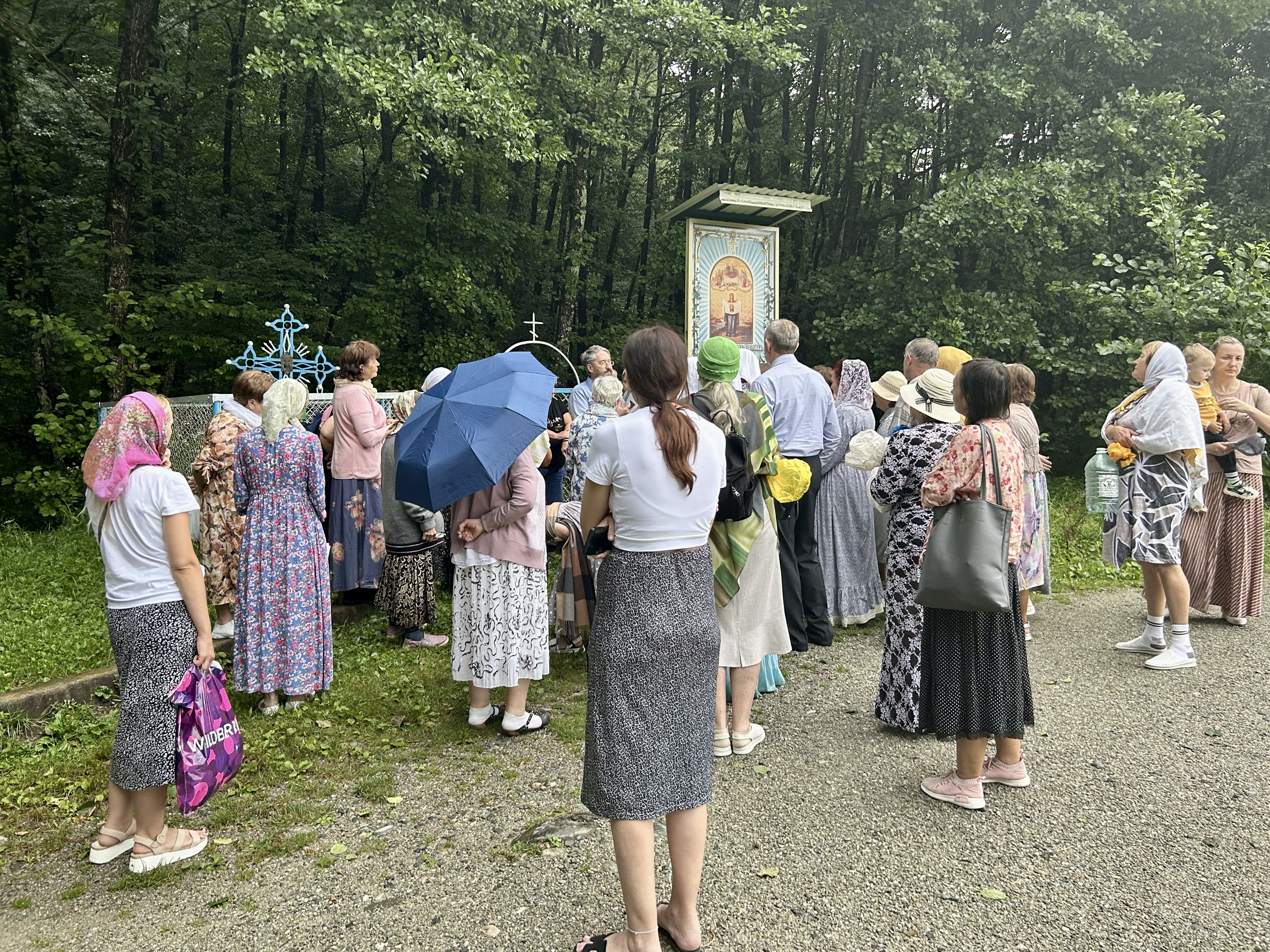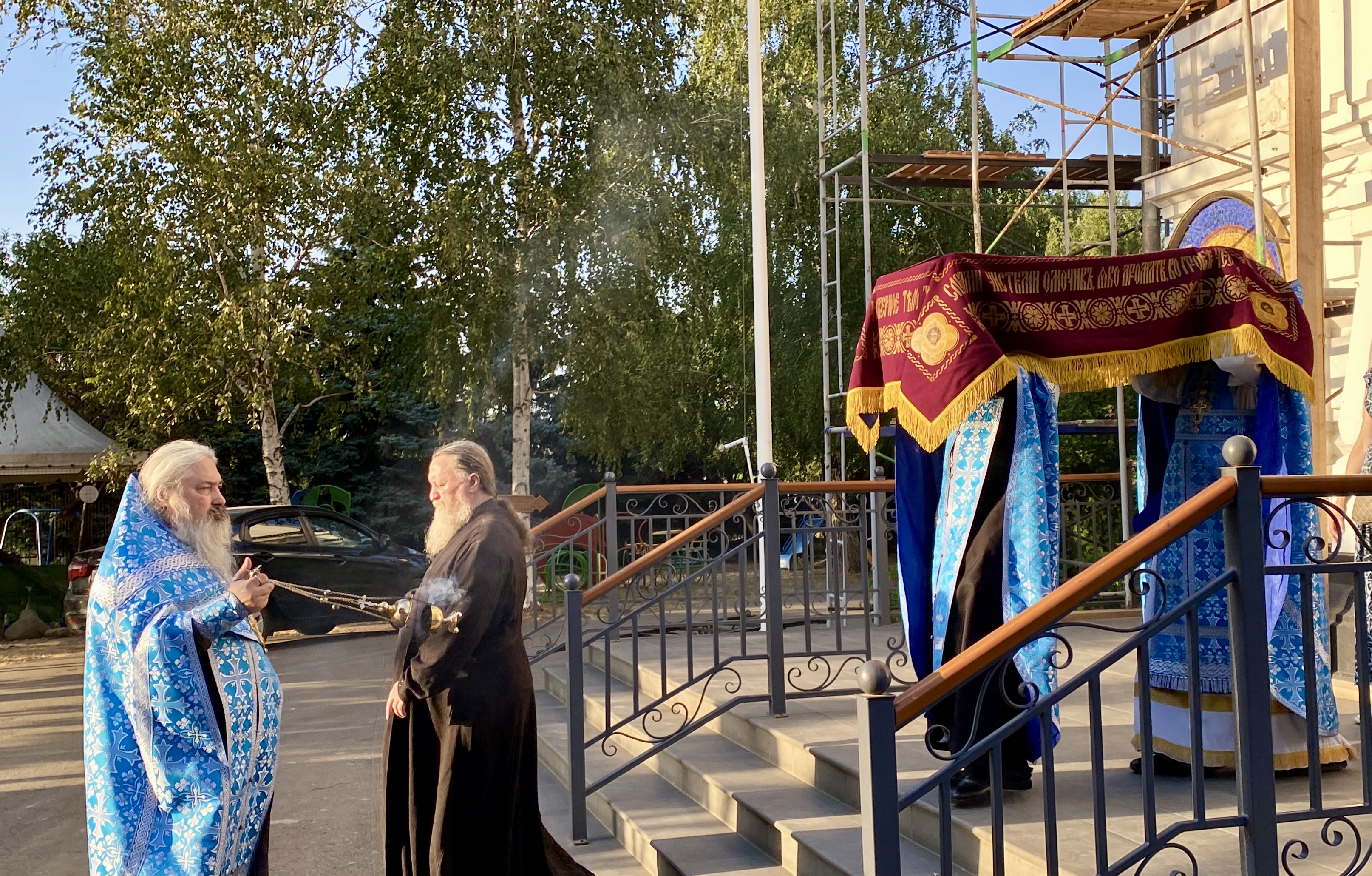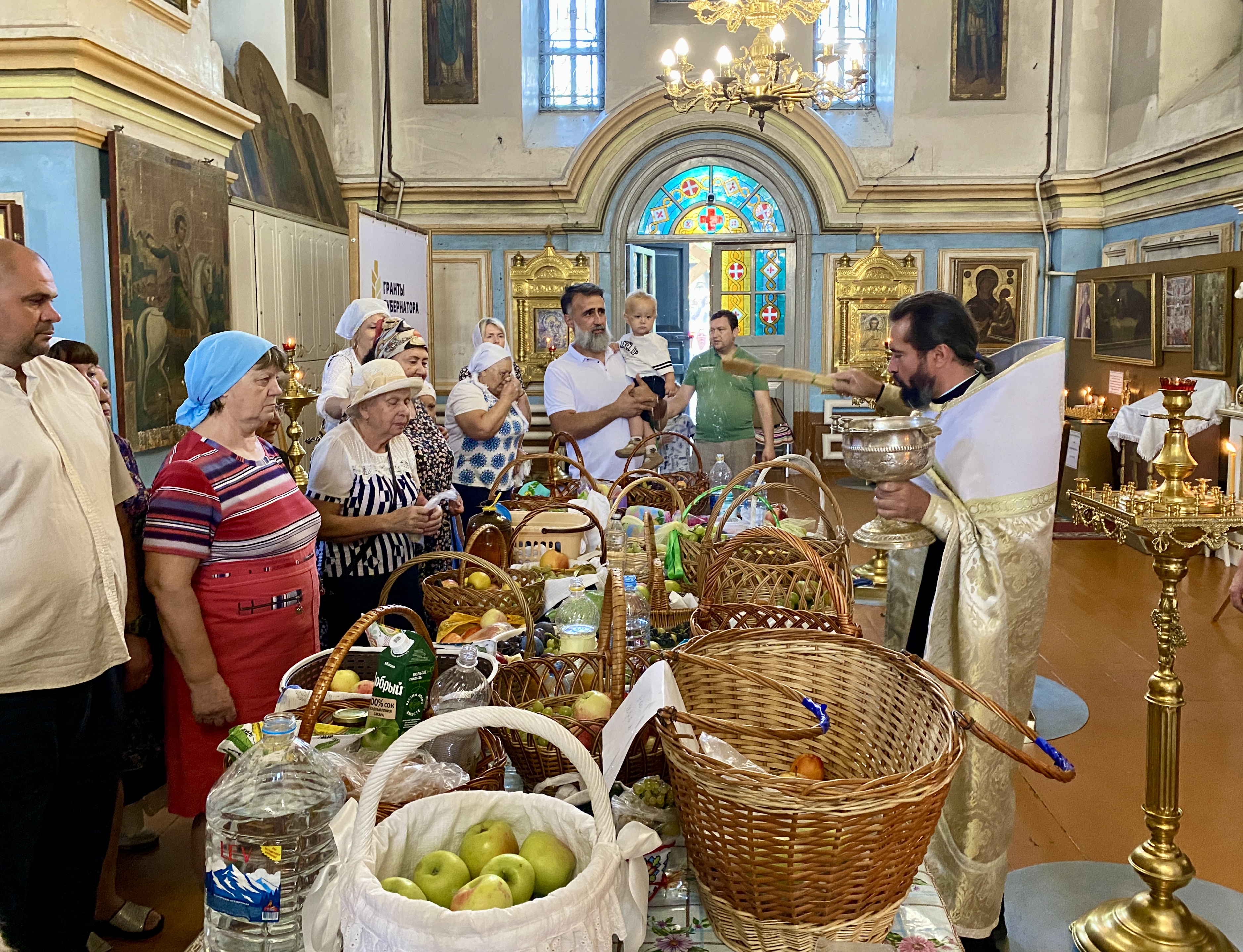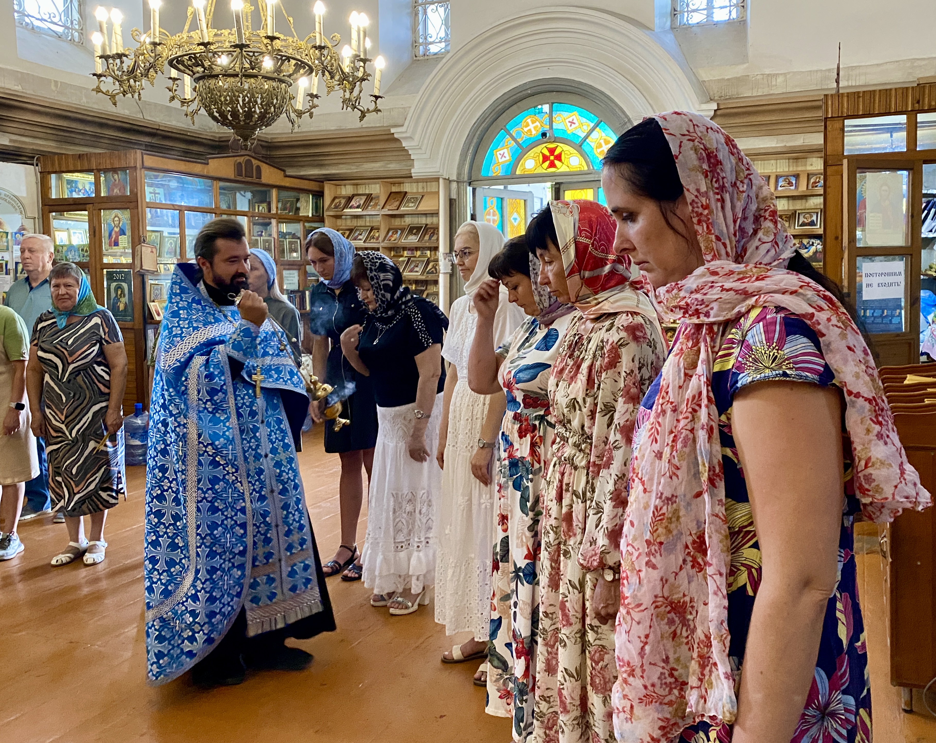 По завершении Литургии священнослужители совершили водосвятный молебен перед иконой Владимирской Божией Матери, после чего с молитвенным пением был совершен Крестный ход со святыней вокруг храма. Во время шествия батюшки щедро окропляли всех молящихся святой водой.