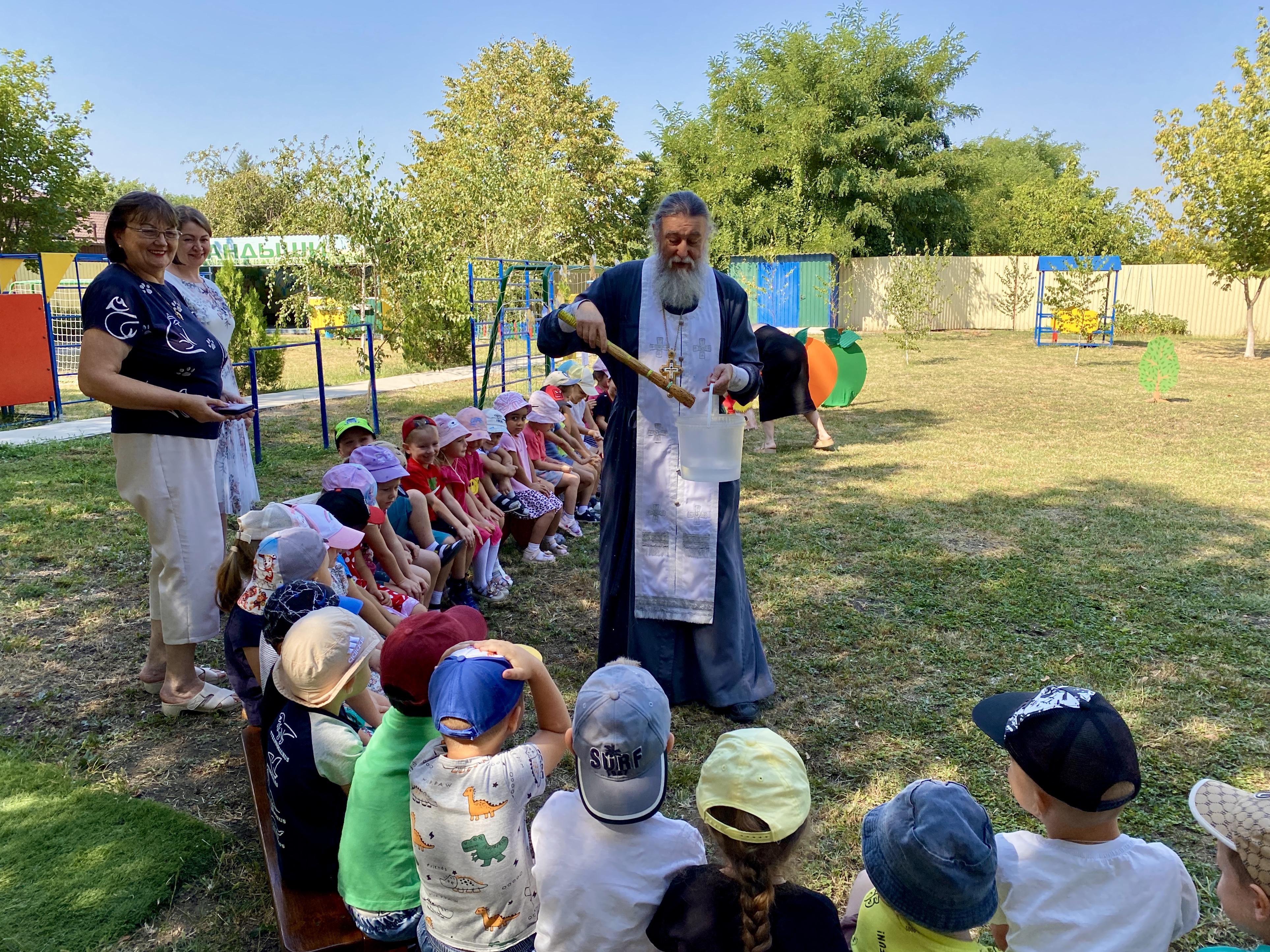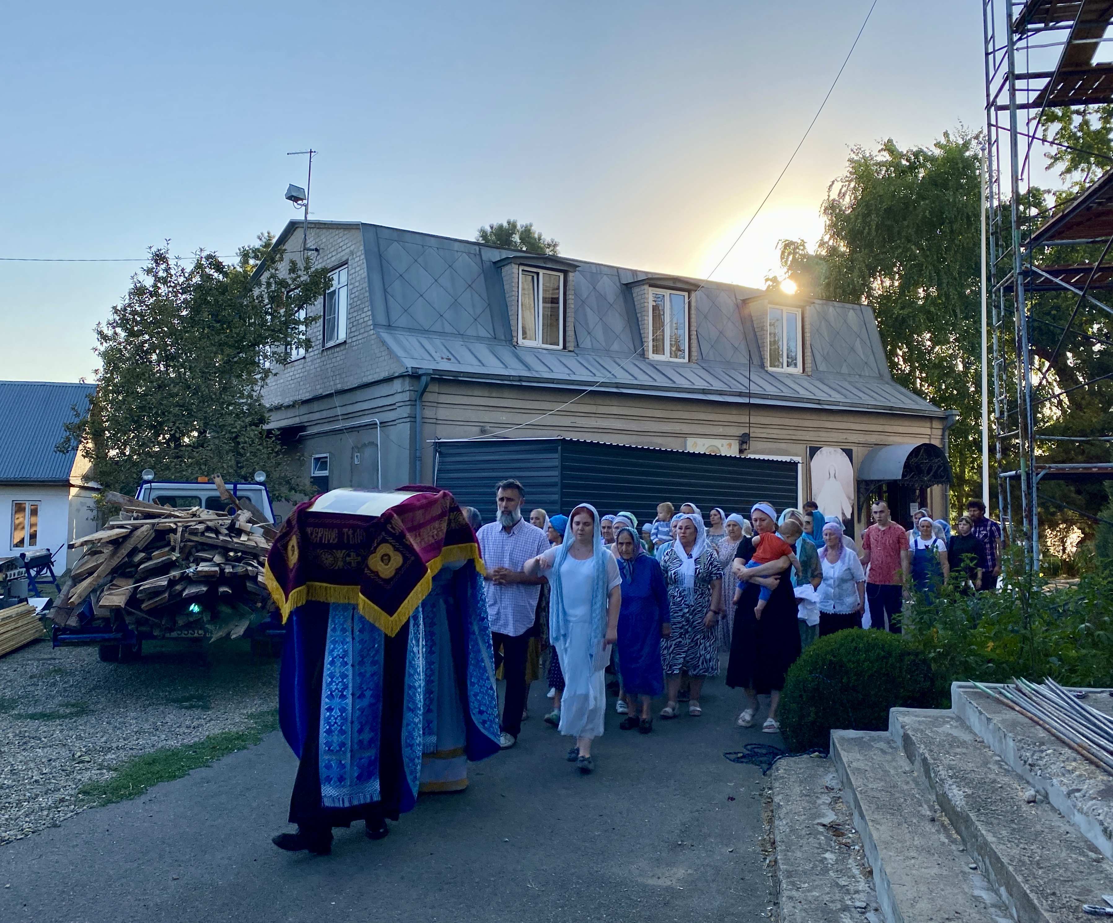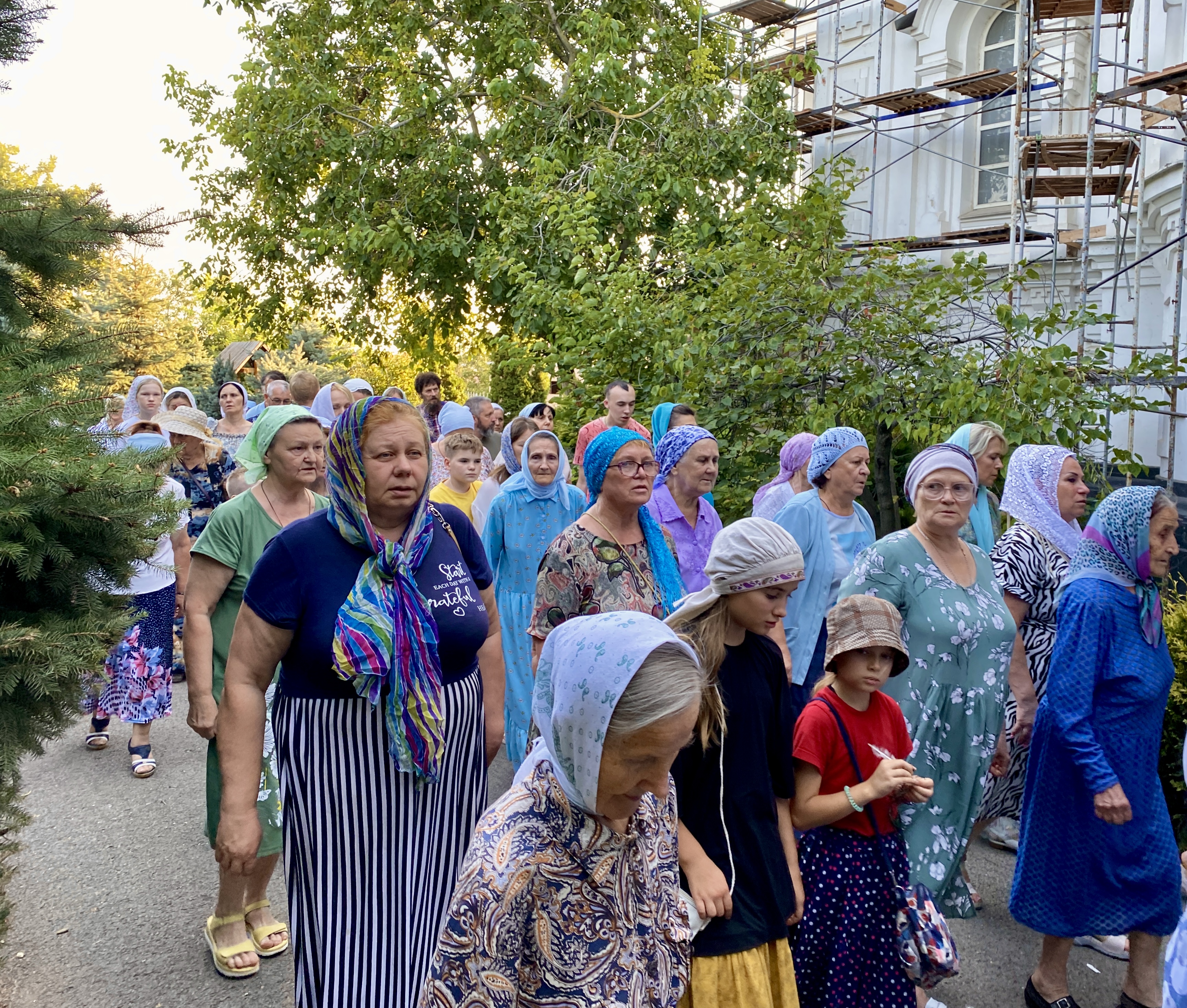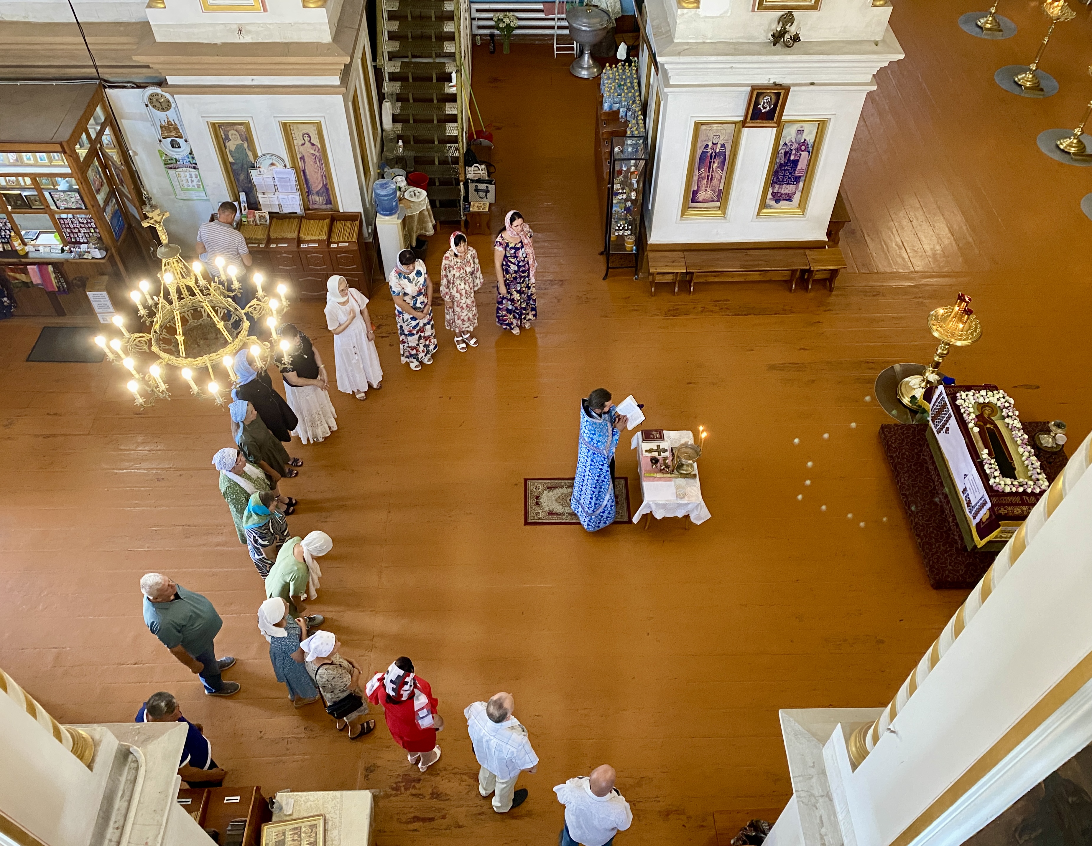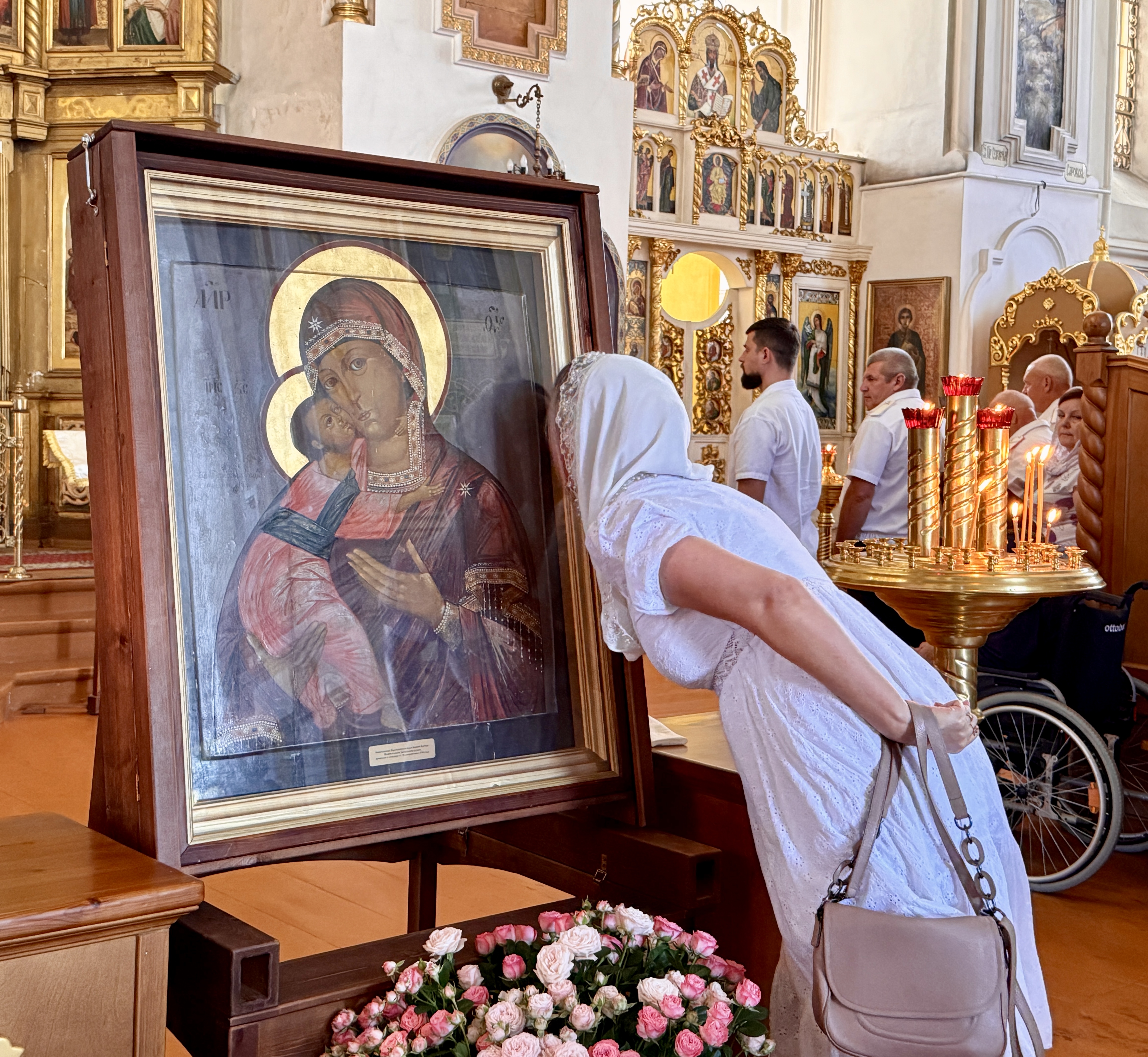 По завершении Литургии священнослужители совершили водосвятный молебен перед иконой Владимирской Божией Матери, после чего с молитвенным пением был совершен Крестный ход со святыней вокруг храма. Во время шествия батюшки щедро окропляли всех молящихся святой водой.