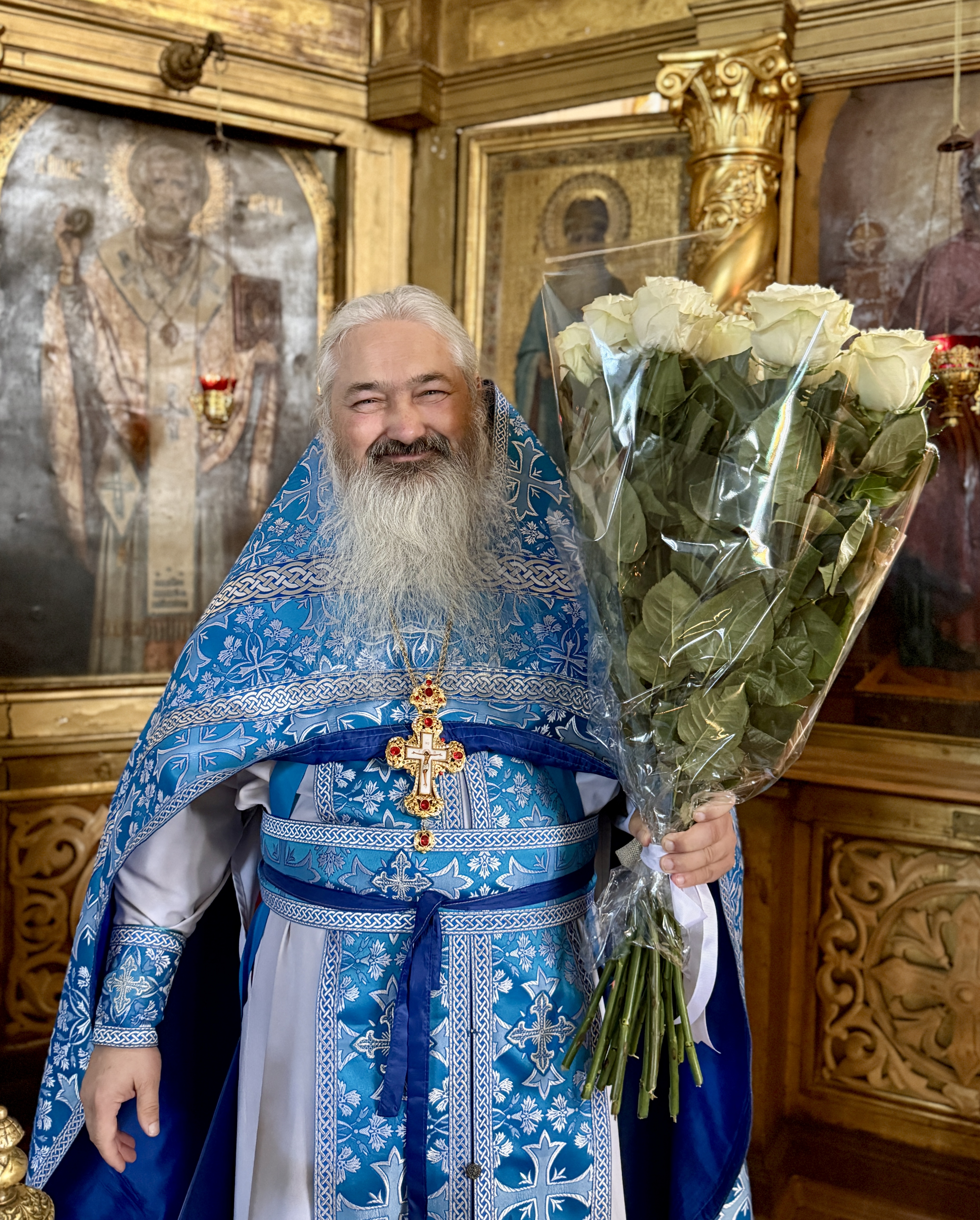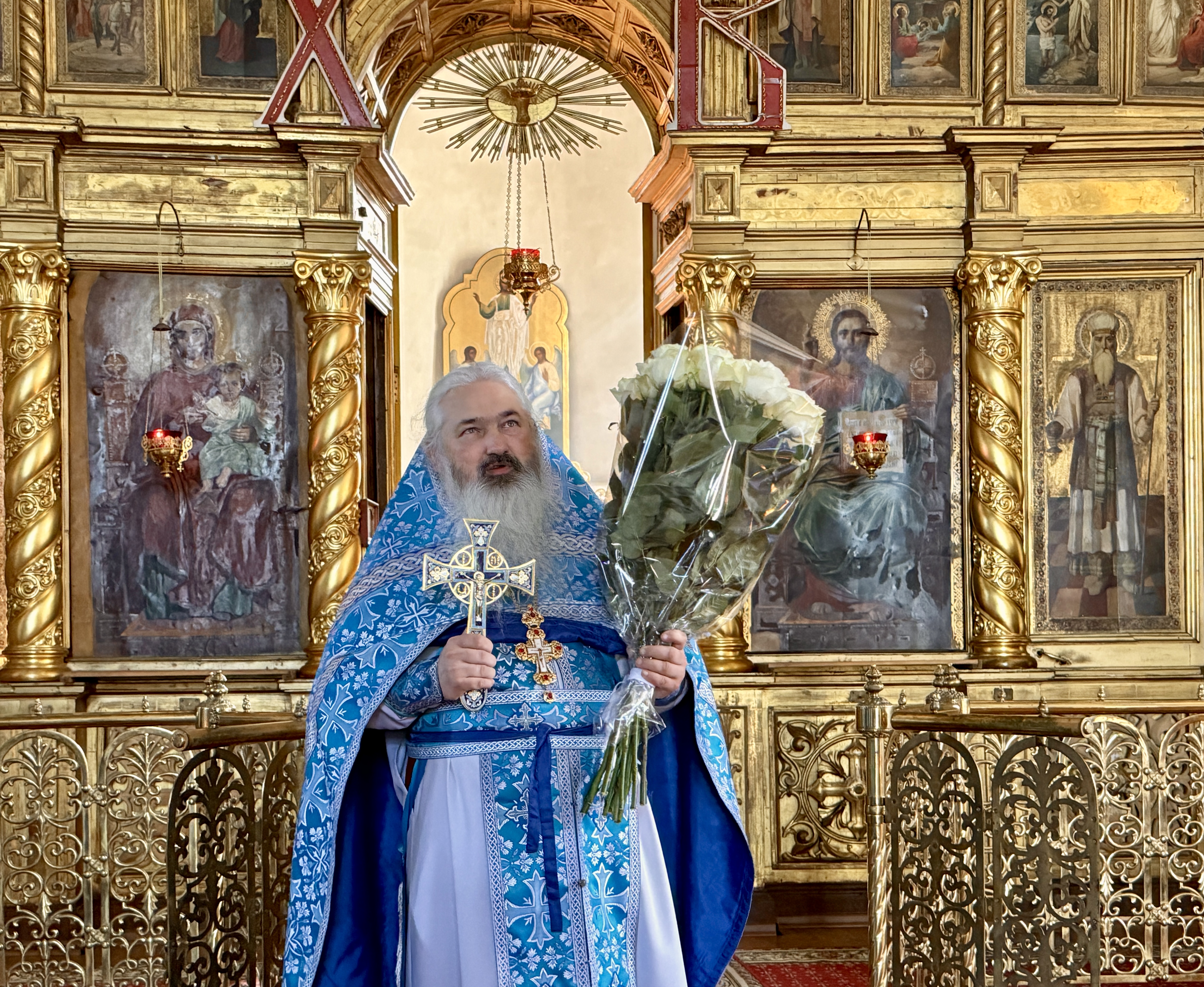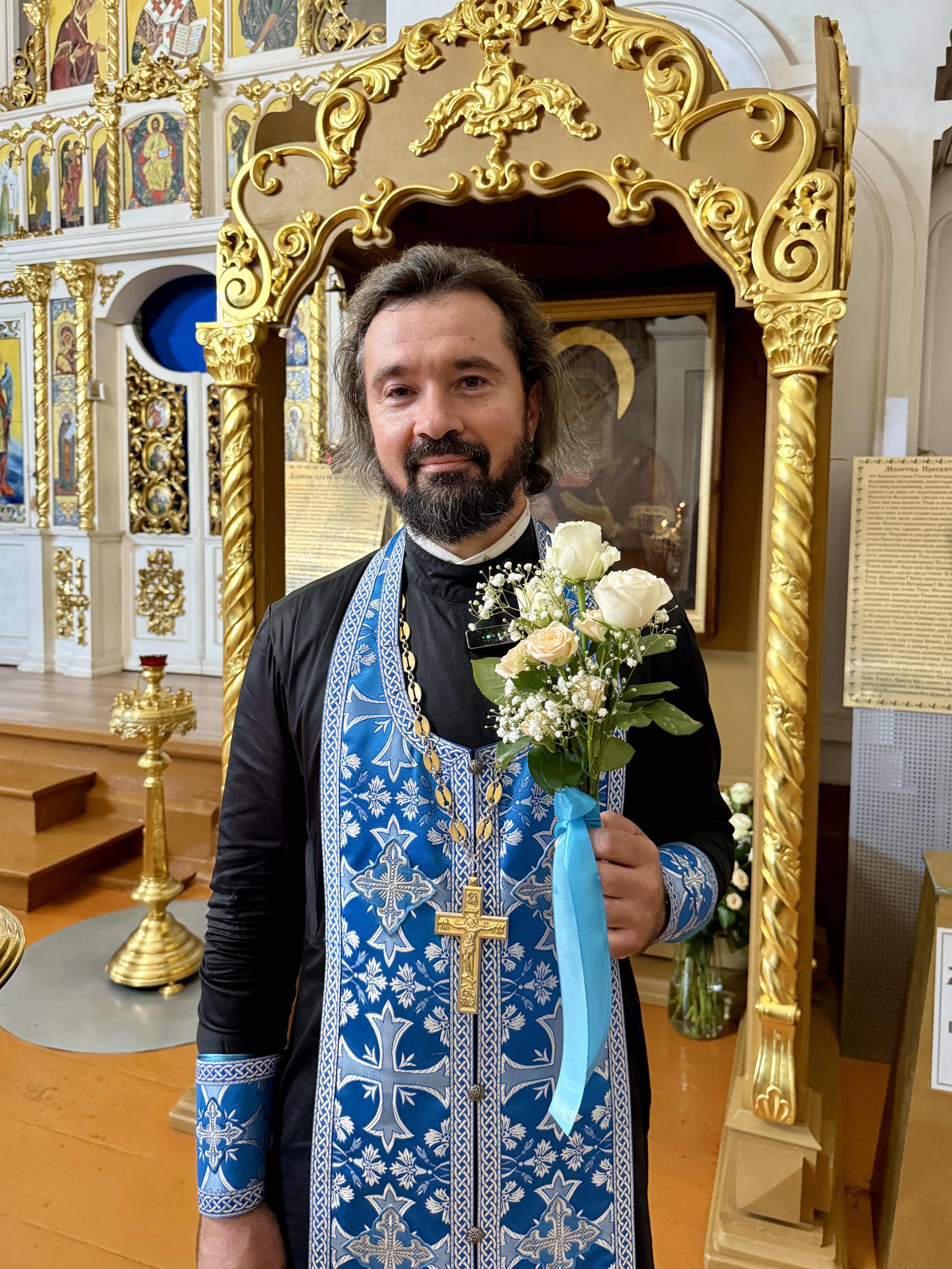 По завершении богослужения настоятель храма иерей Павел Максимец поздравил отца Максима с днём рождения и вручил ему букет белоснежных роз.